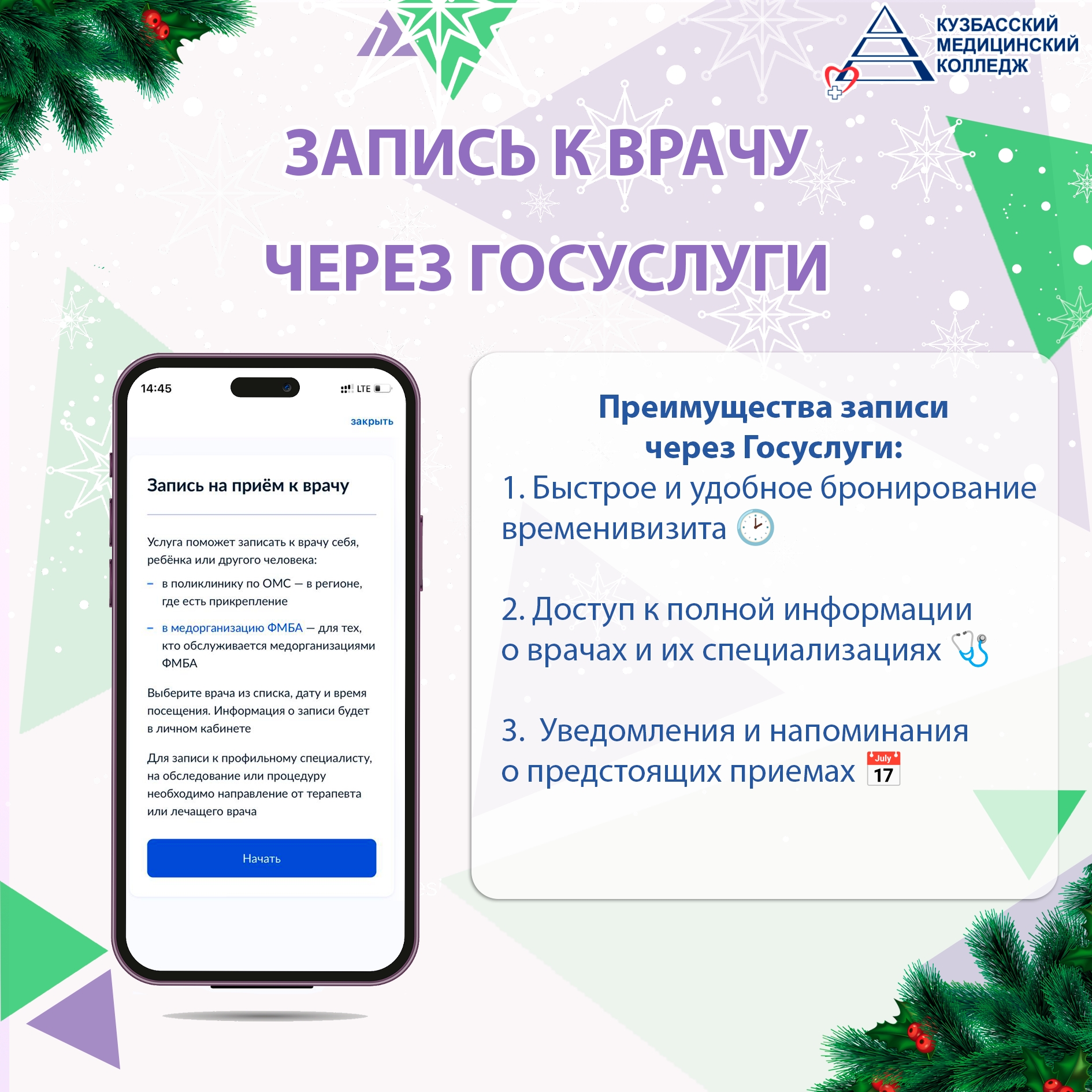 Студенты Кузбасского медицинского колледжа советуют: записывайтесь к врачу через Единый портал государственных и муниципальных услуг – это быстро, удобно и доступно каждому!