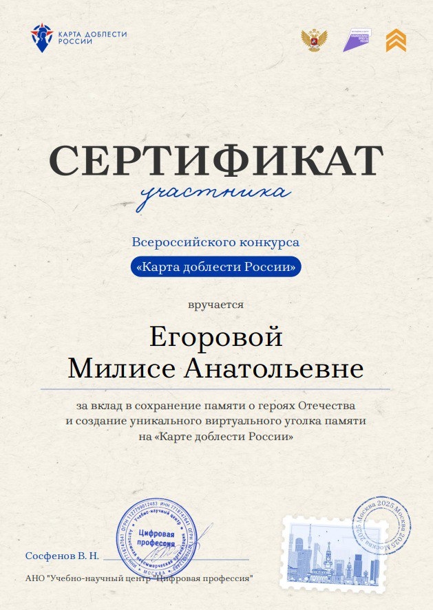 Студентка Кузбасского медицинского колледжа Милиса Егорова была награждена сертификатом участника Всероссийского конкурса «Карта доблести России» за вклад в сохранение памяти о героях Отечества и за создание уникального виртуального уголка памяти на «Карте доблести России».