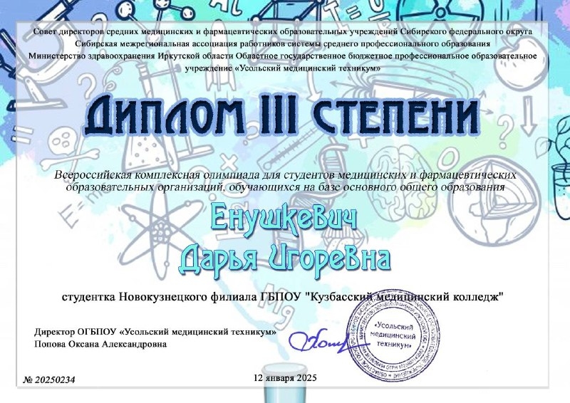 Студенты Новокузнецкого филиала нашего колледжа приняли участие во Всероссийской комплексной олимпиаде для студентов медицинских и фармацевтических образовательных организаций, обучающихся на базе основного общего образования